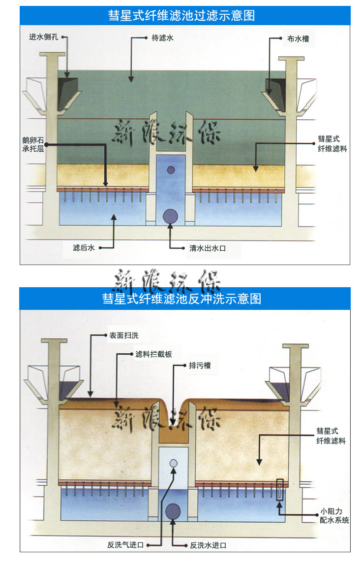 彗星式纖維濾池是一種重力式深層過濾池,它采用彗星式纖維濾料,小阻力配水布,氣水反沖,變水位或恒水位過濾方式,是目前深層過濾池中去除懸浮物較的過濾技術。